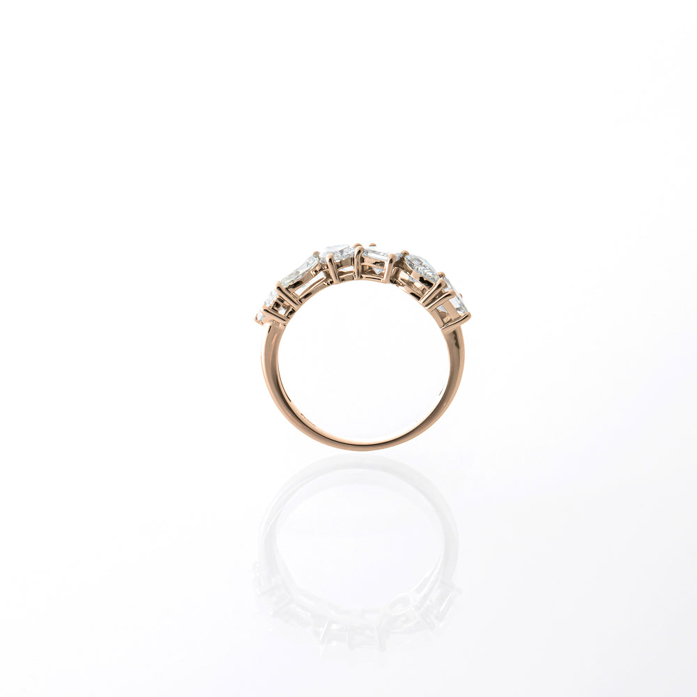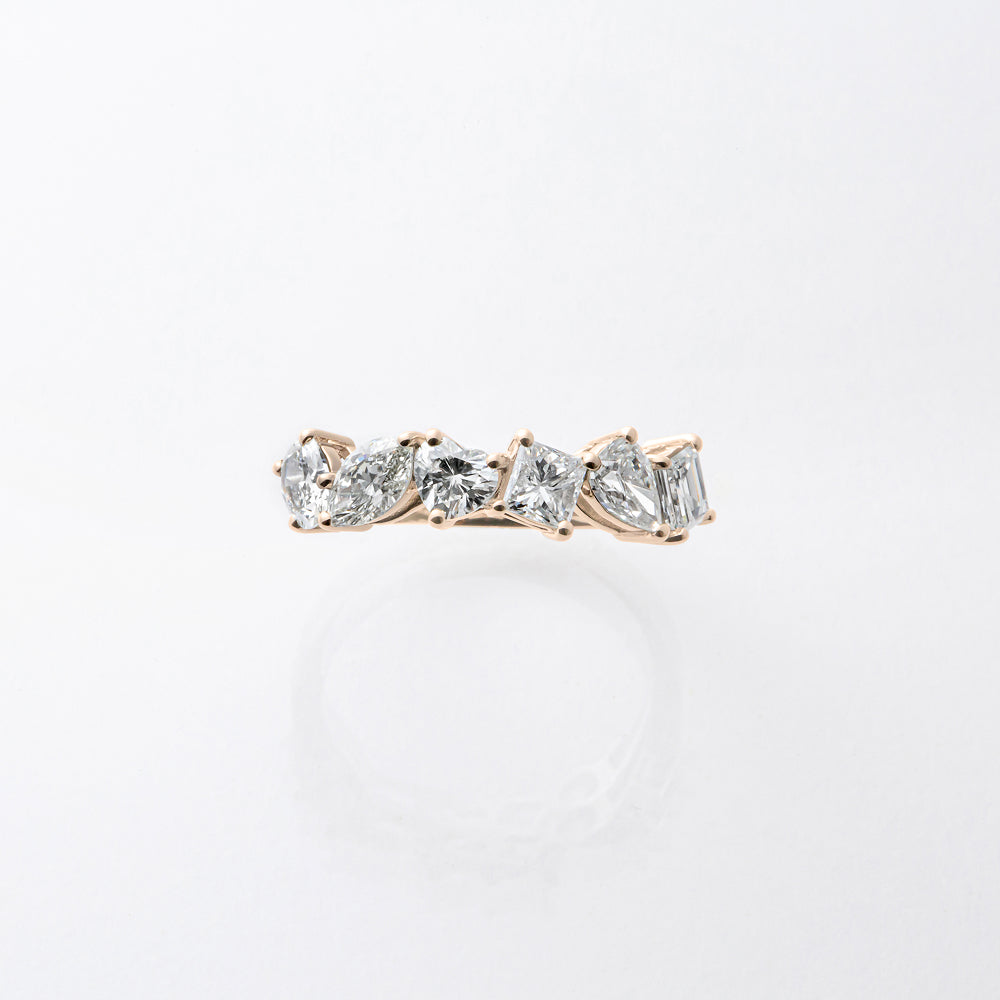 マルチシェイプハーフエタニティリングは、7つの変形カットのダイヤモンドを使用しており、一つとして同じものがない、完全なオリジナルデザインとなっております。